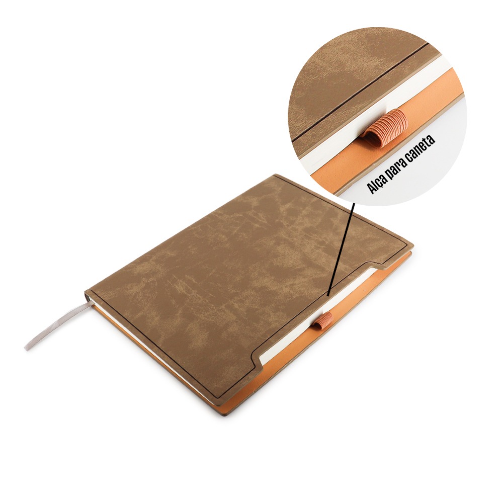 Elegante e confortável ao toque, ideal para anotações do dia a dia ou brindes corporativos. Possui acabamento aveludado, suporte para caneta e design sofisticado.
