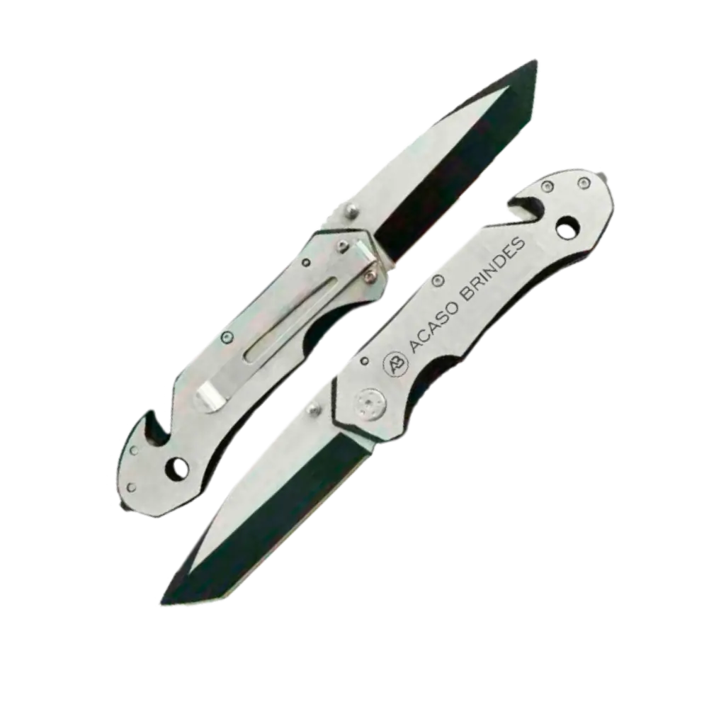 Possui cabo e lâmina de aço inox , presilha para bolso e quebra vidros de emergência.