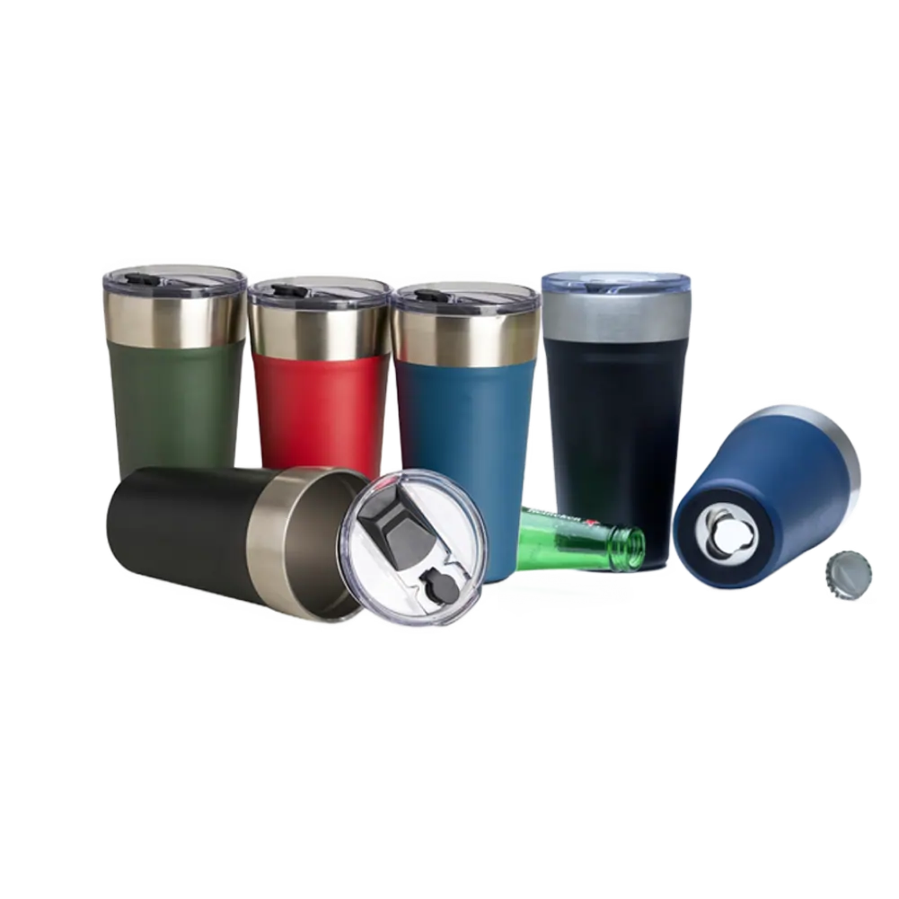 Copo térmico com capacidade de 500ml, acompanha tampa com canudo e abridor de garrafas na base. Ideal para manter bebidas na temperatura por mais tempo.