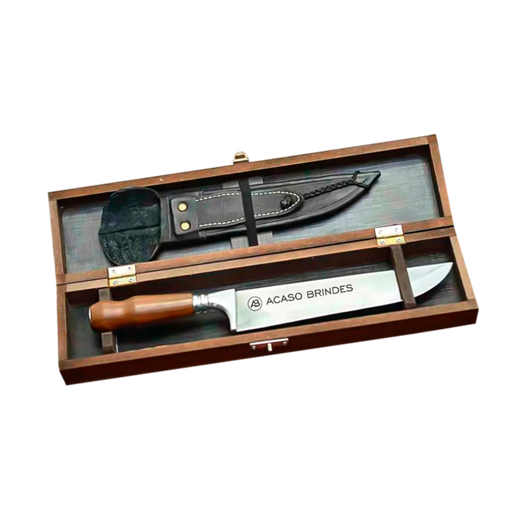 O estojo é composto por uma faca 08 polegada madeira e uma bainha em couro.. Faca de excelente qualidade, em aço 420 inox .