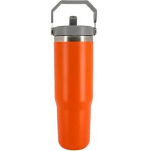 Possui tampa rosqueável, com detalhe superior em relevo, e pode ser utilizada com líquidos quentes e frios.
