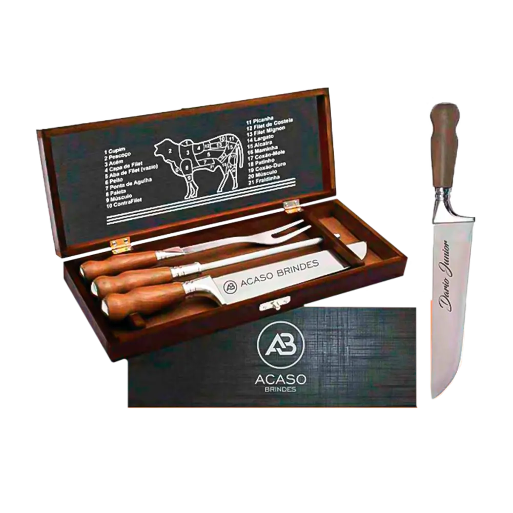 O Kit boi madeira é composto por 3 peças, sendo uma faca 09 polegadas, um afiador e um garfo. É uma faca de excelente qualidade, com aço 420 inox .