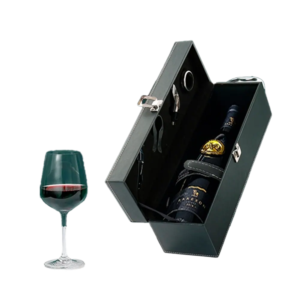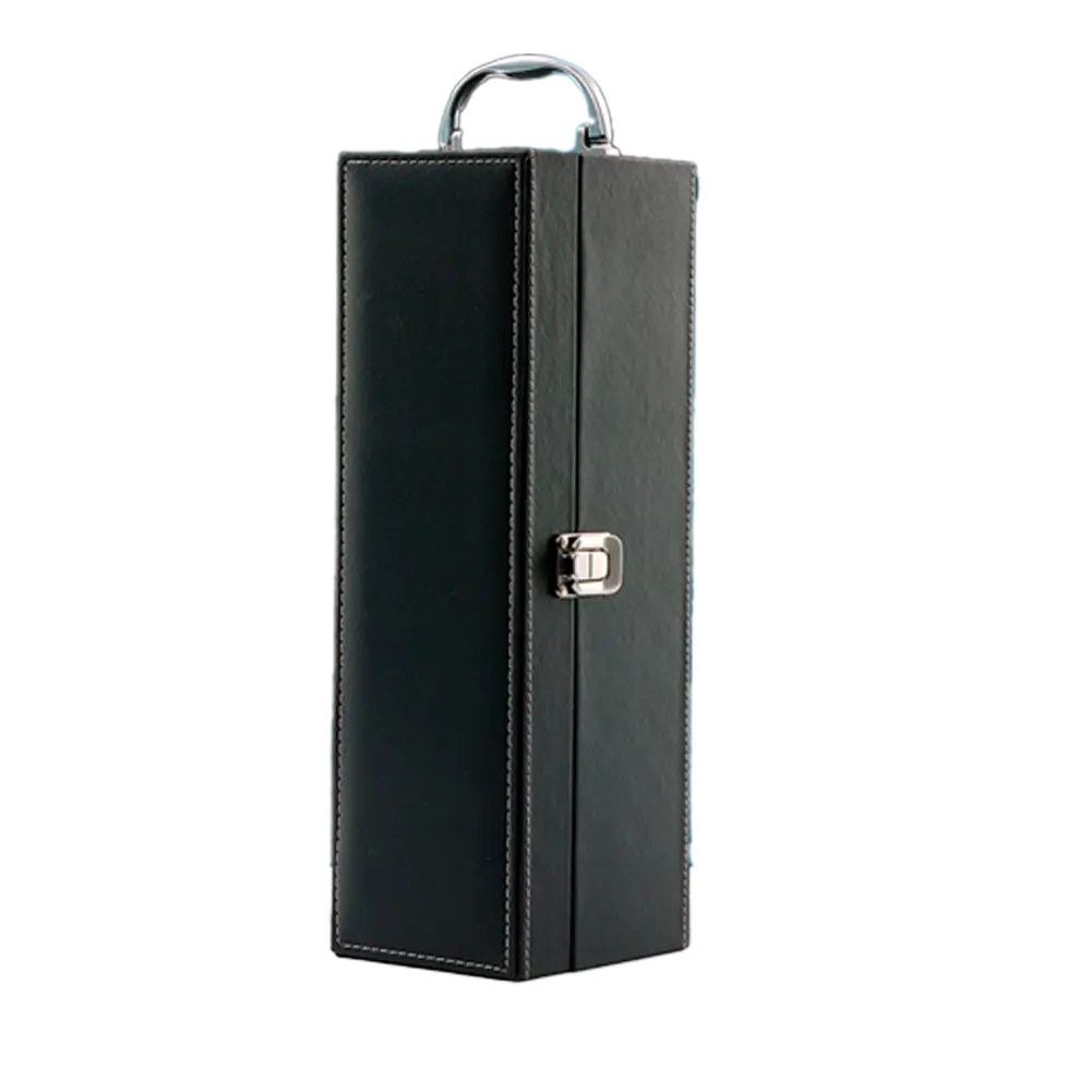 Conjunto de vinho com caixa em couro sintético, ideal para armazenar e transportar uma garrafa de vinho com praticidade e elegância.