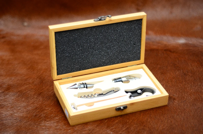 Kit para Vinho com Caixa de Bambu 5 peças Fina caixa em madeira com estojo interno em espuma acomoda cada item separadamente, ótimo presente ou para usos em ocasiões especiais. Para Servir com estilo, qualidade e muito bom gosto. Mostre todo o seu requinte e desfrute da qualidade dos melhores vinhos em ótima companhia. Um charme especial para pessoas que prezam acima de tudo o bom gosto.