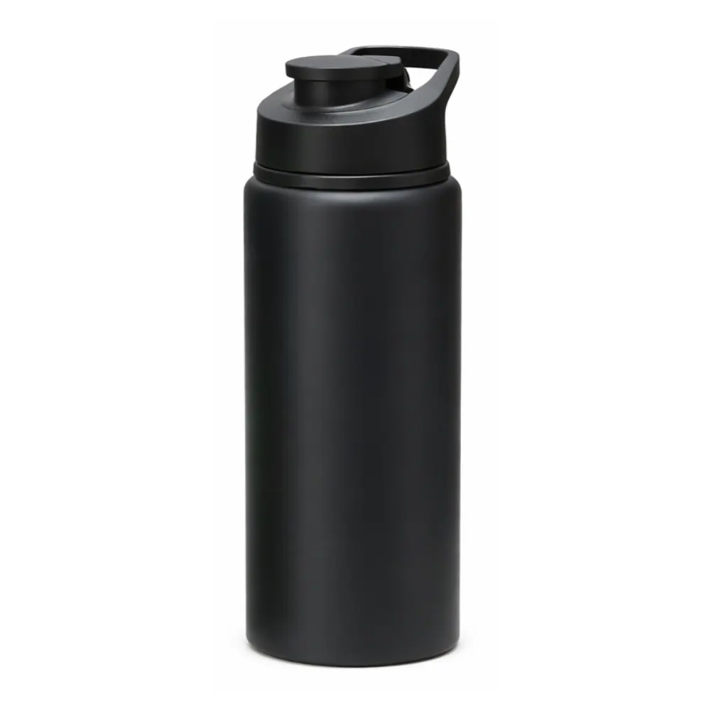 Possui tampa plástica rosqueável, alça e tampa protetora para o bocal.