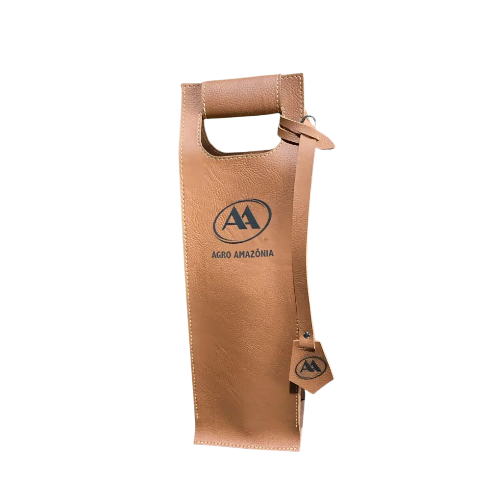 Suporte para kit vinho em material sintético com acabamento premium. Possui alça para transporte e fechamento com botão.